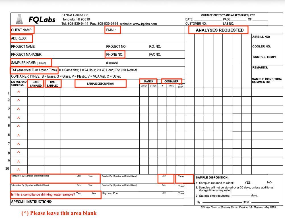 - Analysis (Check box) (*required): check off analysis/analyses requested for each sample